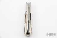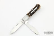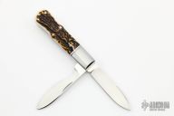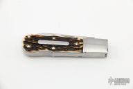 This two-blade Barlow from Ryuichi Kawamura features two hand rub satin finished blades with Ryu's mirror polished ricassos and swedges, both have nail nicks. The second blade is not sharpened. Both have half-stops. Spring is flush in all positions. The handle has fluted stainless steel bolsters, stainless steel liners and springs, covers on this piece are premium Sambar stag and both are nicely matched. This is a gorgeous example of Ryuichi's talent/craftsmanship. This piece is in Excellent condition.