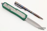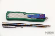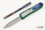 This Daytona OTF automatic features a D/E bead blast blade with a standard edge, and a green handle with bubble inlays. Maverick Mokuti pocket clip. Glass breaker. Marked "USN 2011 G3" on blade.  Includes Maverick Mokuti pry-bar.  Includes a stingray padded zippered case. Excellent condition.