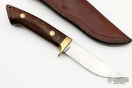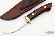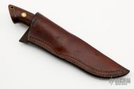 This Hunter by Bob Loveless features a polished blade with the "R.W. Loveless maker Lawndale, California." logo. Full tapered tang construction. .185" Blade Stock 1.011" Blade Depth. The handle has a brass guard and dymondwood scales with black liners, lanyard hole. "26" on ricasso. Comes with a brown leather sheath, not original, but fits perfectly. Has some light pitting/staining on the blade, has some scratches, otherwise good condition.