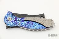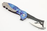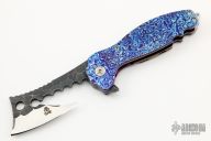 This Ratchet flipper by RichMade Knives features a satin finished blade with notched thumbrest and a flipper. The blade has rock pattern texturing. The handle has a Timascus frame with an aluminum backspacer and tip up pocket clip. Nice blade seating, detent and lock up. Rides on bearings. Excellent condition. Comes with zippered case and COA Dated, 2019.