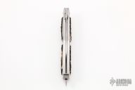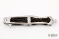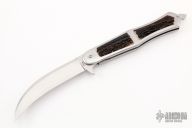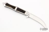 This Hawkbill Linerlock Flipper by Eugene Shadley features a hand rub satin finished hawkbill blade with false top edge and a flipper. The handle has a satin finished stainless steel frame with stag inlays and a satin finished stainless steel backspacer and pommel. #1377 on the blade. Has a few very light scratches, otherwise excellent condition. Comes with a velcro case.