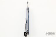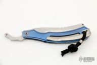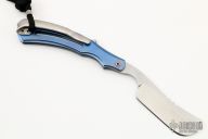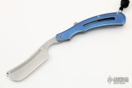 This Safadage Razor by Korth Cutlery features a stonewashed and chisel ground blade with a fuller. The handle has an orange peel finished titanium frame with matching backspacer and tip up clip. Comes with a nylon velcro case. Excellent condition.