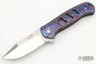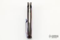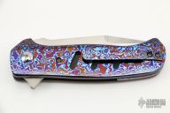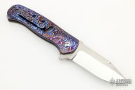 This Patton framelock flipper by Chad Nell features a mirror polished blade with satin flats, flipper and notched thumbrest. Handle has a full polished Timascus frame with matching tip, and Timascus backspacer. Has ceramic bearings. Nice detent, lockup and blade seating. Has a few light scratches, otherwise excellent condition.