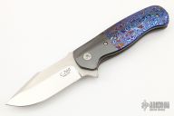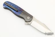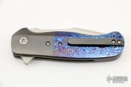 This Patton framelock flipper by Chad Nell features a mirror polished blade with satin flats, flipper and notched thumbrest. Handle has zirconium bolsters, polished Timascus scales, with matching tip, and floating zirconium backspacer. Has ceramic bearings. Nice detent, lockup and blade seating. Has a few light scratches, otherwise excellent condition.