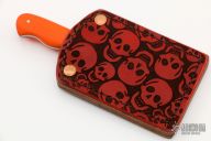 This Angry Ant by Mike Snody features a chisel ground satin finished Magnacut blade with .105" blade stock and .725" blade depth, full tang construction with orange G-10 scales. Comes with a custom leather sheath. New from maker.