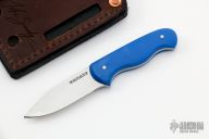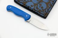 This Angry Ant by Mike Snody features a chisel ground satin finished Magnacut blade with .105" blade stock and .725" blade depth, full tang construction with blue G-10 scales. Comes with a custom leather sheath. New from maker.