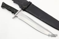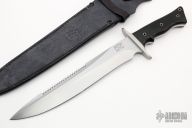 This Model 2 by Walter Brend features a double hollow ground blade with a matte finish and sawteeth on the spine as well as a sharpened top edge, .299" blade stock and 1.903" blade depth, full tang construction. The handle has a matte finished titanium double guard, and black linen micarta scales, hollow tube pins and lanyard hole. Comes with a custom black leather sheath by Skin Bender Leather, and its original factory cordura sheath. This knife is beautiful and sports the "Walterboro SC" logo. Excellent condition.