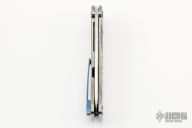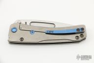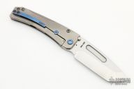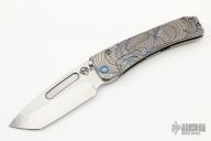 This Slim Midi Marauder from Medford Knife and Tool features a stonewashed drop point tanto blade with thumb stud and fullers. The handle is comprised of a tumbled and laser engraved titanium frame with tip up clip over anodized spacers. Excellent detent, lockup, and seating. Original hard case and COA dated Sep 14, 2021. Excellent condition