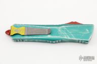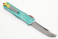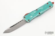 This Combat Troodon by Microtech features an Apocalyptic finished tanto blade. The handle has a distressed green aluminum frame with red hardware and a tip down stainless steel clip. Comes with original box and papers. Dated 11/2020 and s/n 1082. Excellent condition.