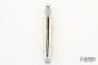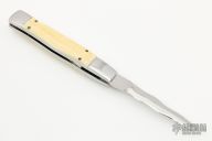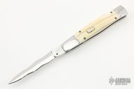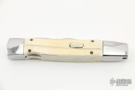 This Auto by the late Chuck Stewart features a mirror finished Kris blade with false top edge. The handle has a mirror polished stainless steel frame, mammoth ivory inlays, stainless steel backspace lock. The button has a mammoth ivory overlay. Has just a few very light scratches, otherwise excellent condition. Comes with a leather pouch. This is the best Chuck Stewart auto I personally have ever seen.