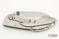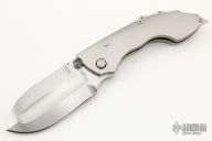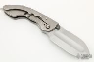 This Gladius by Phil Harvey was modeled after a Roman Short Sword, it features a multiground hand rub satin finished blade with dual thumbstuds, the blade stock is .245" thick. The handle has an orange peel finished titanium frame and clip with hidden screws, stainless steel backspacer, colored pivot collars. Has a stainless steel lockface insert. Nice detent, lockup and blade seating. This thing is a beast. Has some light scuffs and scratches, excellent condition otherwise.
