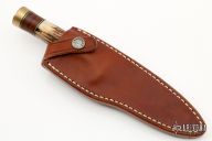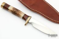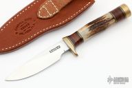 This Model 26 Pathfinder by Randall Made Knives is one of Randall's best-selling models. It features a drop point satin finished blade with .146" blade stock and .919" blade depth, hidden tang construction. The handle has a brass guard and butt, stag grip and black/brass/leather spacers. Comes with a brown leather sheath. Has a few light scratches, otherwise excellent condition.