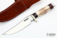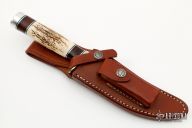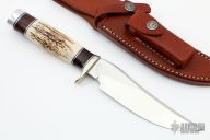 The Model 27 is an ideal all-around heavy-duty sportsman's knife. This knife has a satin finished blade with .223" blade stock and 1.343" blade depth, hidden tang construction. The handle has a brass guard and duralumin butt, stag grip with stacked leather, black and duralumin spacers. Comes with a brown leather sheath. Has a couple light scratches, otherwise excellent condition.