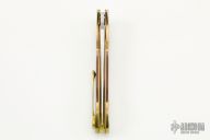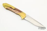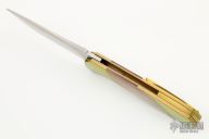 This Axis linerlock flipper by William Tuch features a hand rub satin finish recurve blade with flipper. The handle has carved, fluted, textured, anodized bolsters front and rear, mokuti inlay, satin finished titanium liners with jeweled interiors, floating backspacer and a two-tone anodized titanium tip up clip. Rides on bearings, nice detent, lockup and blade seating. Comes with a zipper case. Has some light scratches, otherwise excellent condition.