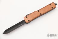 This UTX-70 OTF automatic by Microtech features a Spartan DLC stonewash finished blade with a standard edges. The handle has a black aluminum frame with tumbled copper top, black stainless steel tip down clip and hardware. Serial number 163 and dated 05/2021. Comes with original box and papers. Excellent condition.