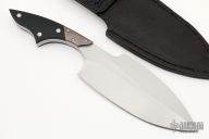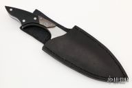 This knife by Phil Harvey features a hand rub satin finished blade .41" bladestock, 2.5" blade depth, full tang construction. Blued Damascus bolsters, and g10 scales. Comes with leather sheath. Excellent condition.