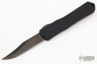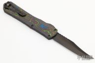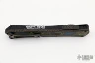 This Manticore-X by Heretic Knives features a black DLC bowie blade with notched thumbrest. The handle has a black aluminum frame with 80's camo carbon fiber back cover, black stainless steel hardware and black tip down clip, and titanium thumbslide. Comes with original box, papers and sample tube of OTF Lube. S/N 173. Excellent condition.
