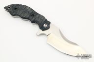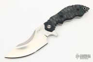 This Hard 1 Fixed blade by Yuna Knives features a satin finished blade with nearly sharpened swedge on spine, notched thumbrest, .264" blade stock and 1.947" blade depth, full tang construction. The handle has contoured black/blue G-10 scales with lanyard hole. Excellent condition. 4.5" blade and 10.25" overall.