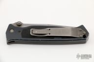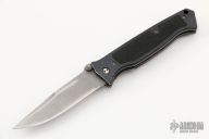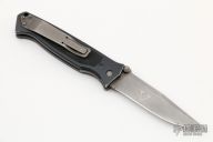 This D/A Vallotton Chameleon by Microtech is dated 5/96, numbered 528, and has the Vallotton logo on the back side of the blade. The release button for automatic opening is under the end of the clip. Perfect function. Has a bead blasted AEBL blade, black aluminum scales with rubber inlays, bead blasted titanium liners, tip up titanium clip. Has been used, carried and resharpened, has scuffs/scratches/dings. Nice detent, lockup, action and blade seating. Nice function. Fair condition.