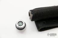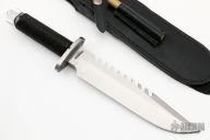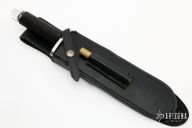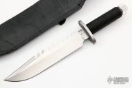This SURV9 Survival Bowie by Ed Martin features a satin finished clip point blade with a sharpened top edge and sawteeth, .273" blade stock and 1.746" blade depth, hidden tang construction. The handle has a stainless steel guard, hollow handle with cord wrap, and removable aluminum butt cap with o-ring and compass. Comes with a black leather sheath. Excellent condition.