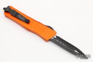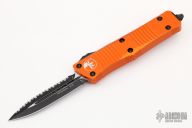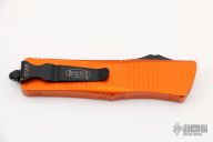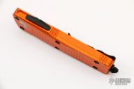 This Troodon by Microtech features a black blade with one fully serrated edge. The handle has an orange aluminum frame with black hardware and tip down clip. Dated 01/2022 and s/n 9526. There is one scratch on the pocket clip otherwise the knife is in Excellent condition.