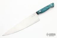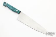 This Chef's Knife by David Hoehler features a hand rub satin finished blade with .090" blade stock and 1.987" blade depth, full tang construction and a nice distal taper on the blade. The handle has dyed birds eye maple burl scales with red liners. Has a few light scratches, otherwise excellent condition.
