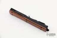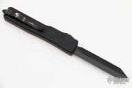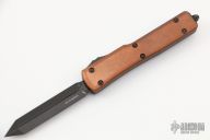 This UTX-70 OTF automatic by Microtech features a Spartan DLC stonewash finished blade with a standard edges. The handle has a black aluminum frame with tumbled copper top, black stainless steel tip down clip and hardware. Serial number 192 and dated 05/2021. Excellent condition.
