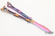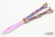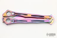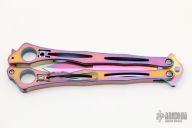 This Spyderfly from Spyderco features a rainbow finished spear point blade with a false top edge. The handles are rainbow finished stainless steel with a tip up clip (4-way reversible). Comes with original box and papers. Has some light scuffs and scratches, great condition otherwise.