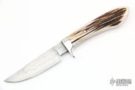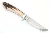 This knife by Ampan Ponyangnok features a hand rub satin finished blade with hamon (SK5 Steel), .163" blade stock and .805" blade depth, mortise tang construction. The handle has a stainless steel guard and a stag grip. Excellent condition.
