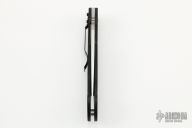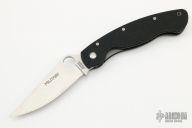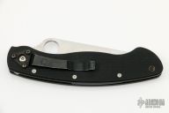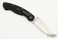 This Military Liner Lock by Spyderco has a satin finished clip point blade with notched thumbrest and thumbhole. Handle is black G10, with stainless steel single liner (lock), black fiber back spacer, stainless steel tip down clip, and lanyard tube pin. Excellent condition. Comes with original box.