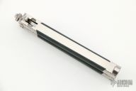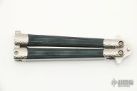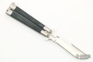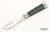 This Balisong by Mauricio Dobruski features a satin finished blade. The handles are full channel construction stainless steel with a matching T-latch. The dovetailed bolsters are integral to the channel and are stippled, green G-10 scales. Comes with zippered case. Marked CB198 on the rear of the blade. Excellent condition.
