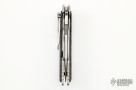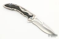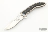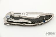 The Avenger by Flavio Ikoma is exclusive to Arizona Custom Knives and only four of these knives were made back in 2007. Notches in spine, thumbrest and rear of knife gives a solid grip in any position. Flipper acts as a finger guard in the open position. Contoured and textured (dirt track) carbon fiber overlays on titanium orange peeled handle. Nice grinds. Fast and smooth assisted opening. A great tactical flipper. Comes with a zippered case.