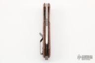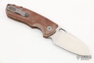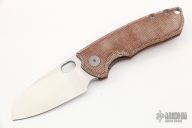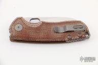 The ACE Riv by Giant Mouse Knives features a satin finished blade with flipper. The handle has brown canvas micarta and blasted titanium frame with tip up clip. Excellent condition.