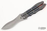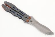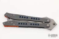 This huge balisong features a double edged tumble finish blade and anodized titanium handles. Orange g10 pivot collars, and backspacers. Notched for grip on thumbrest and handles. Great look and feel. Comes with a zipper case. Has some scuffs and scratches, great condition otherwise.