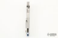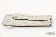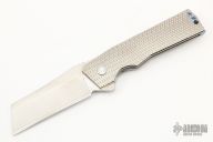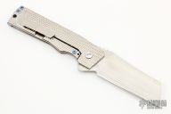 This framelock folder features a satin finished blade with milled bevels, notched thumb ramp and flipper. Satin finished titanium frame with a textured front scale and anodized titanium screws and backspacer. Very smooth action that requires no wrist movement. Nice detent, lockup and blade seating. Rides on bearings. Has some light scuffs and scratches, great condition otherwise. Marked #055 on the frame.