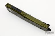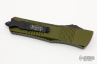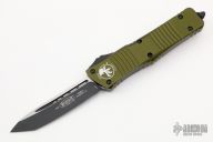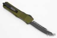 This Combat Troodon OTF automatic by Microtech knives features a black tanto blade, and a green aluminum handle with black hardware, tip down carry. Glass breaker. S/N 36966. Dated 01/2022. Excellent condition.