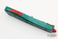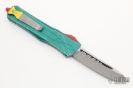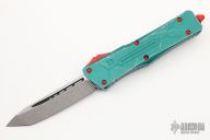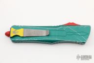 This Combat Troodon by Microtech features an Apocalyptic finished tanto blade. The handle has a distressed green aluminum frame with red hardware and a tip down stainless steel clip. Comes with original box and papers. Dated 05/2022 and s/n 1912. Excellent condition.