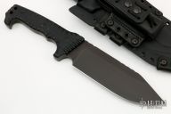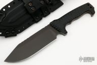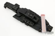 This Custom M-8 by Miller Bros Blades features a black clip point blade with notched thumbrest made from Z-Wear PM steel, .324" blade stock 2.322" blade depth, full tang construction. The handle has black G-10 scales with brown G-10 liners, notched tang top and bottom. lanyard holes at the butt. Comes with a kydex/leather sheath. Excellent  condition.