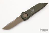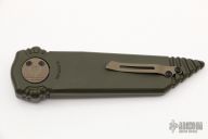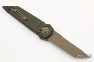 This Dreddlock model sports a green handle with a brown cerakoted blade. The top edge of the knife has been sharpened with a partially serrated cutting edge.