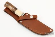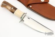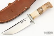 This hunter by Jim Behring features a satin finished convex ground blade with a false top edge, .242" blade stock and 1.337" blade depth, hidden tang construction. The handle has a nickel silver guard, two-piece walrus ivory grip with black/white spacers. Comes with a brown leather sheath. Excellent condition.