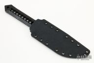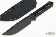 This Custom Bowie by ZU Bladeworxs features a black blade with false top edge, .356" blade stock and 1.463" blade depth, integral construction with notched tang and hole pattern in handle. Comes with a kydex sheath. Excellent condition.