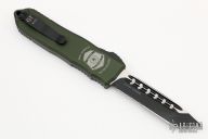 The Recon-Elite Double-Action Automatic has an overall length of 9.75” and a closed length of 5.625"". The 4.1" fine edge, Tanto-point blade is made of all Black finished ELMAX stainless steel. The dual, ventilated blood grooves on the blade allow for lightning fast deployment. The Black Type lll Hardcoat Anodized Aluminum handle is has top and bottom jimping for a non-slip grip. The black thumb slide rides on a stainless steel plate with ceramic balls to reduce friction. It features all black hardware with a black, serial numbered, reversible for right, or left hand pocket clip for tip-down carry. It also has a lanyard hole and hardened glass breaker tip.