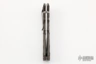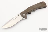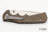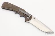This assisted open linerlock by Brian Tighe features a satin finished blade with dual thumbstuds and thumbramp. The handle has a bead blast finish titanium frame, sculpted micarta scales, titanium backspacer, matching titanium tip down clip. Nice lockup and blade seating. Comes with glass/wood display box. Excellent condition.