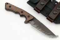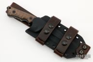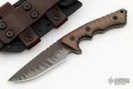 This M-27 by Miller Bros Blades features a drop point blade with .279" blade stock 1.341" blade depth, full tang construction. The handle has textured brown G-10 scales with black G-10 liners, lanyard hole, extended tang. Comes with a kydex/leather sheath. Excellent condition.