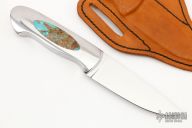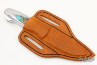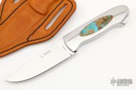 This Hunter from Leonard Toews features a drop point mirror finished blade with .116" blade stock and 1.187" blade depth, full tang construction. The handle has mirror polished stainless steel scales with turquoise inlays. Includes leather sheath with belt loops. Has a few light scratches, otherwise excellent condtion.