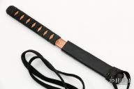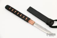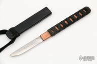This is kozuka has a symmetrically ground blade with a Samurai wrapped cord handle. .074" Blade Stock .44" Blade Depth. Copper wrapped tang and ricasso. Includes the original sheath. Good Condition.