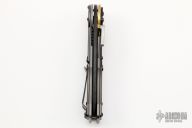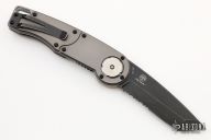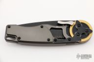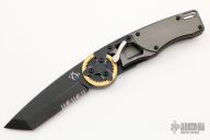 This is a knife from the GH-Series Gearhead folding knife by Mantis Knives. The "steampunk-style" Gearhead liner lock folder is equipped with a unique gear-driven pivot with one large gear, three small gears and a thumb lever used to deploy the blade when pushed down. It features a flat 3.38" plain edge tanto blade and measures just under 5" when closed. The gray handle scales are made from aluminum with a stainless steel backspacer and tip-up pocket clip. The GH2022TBS Gearhead comes in a black stonewashed finished blade but is available in a variety of styles and finishes.