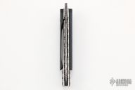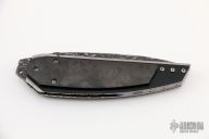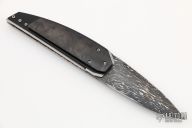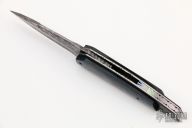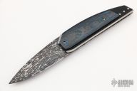 This Strike Linerlock Flipper has a Damascus blade with fileworked spine and flipper. Handle has black/blue carbon fiber scales over black G-10 and fileworked titanium liners, and fileworked titanium backspacer with abalone inlay. The scale on the b-side is also the clip, tip down carry. Nice blade seating, lockup and detent. Excellent condition. Comes with a velcro case.