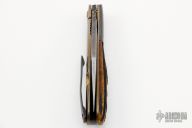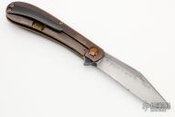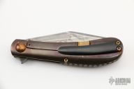 This Backpocket flipper from Doc Shiffer features a 1095 blade with hamon and notched thumbrest. The frame is bronze anodized titanium with a stag scale and zirconium bolster. The pocket clip is also crafted from zirconium and is positioned for tip up carry. Nice lockup and detent. Has a couple light scratches, otherwise excellent condition.