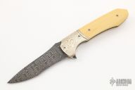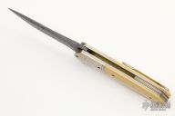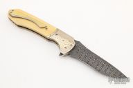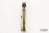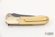 This Axis linerlock flipper by William Tuch features a Rob Thomas Spirograph Damascus recurve blade with flipper. The handle has fluted mokume bolsters, yellow Westinghouse paper micarta scales, satin finished titanium liners with jeweled interiors, floating fluted mokume backspacer and a two-tone anodized titanium tip up clip with a carved copper penny spacer. Rides on bearings, nice detent, lockup and blade seating. Comes with a velcro case. Excellent condition.